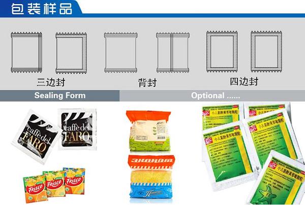 該機(jī)適用于包裝各種顆粒、粉混合物料。如:沖劑、麥片、白砂糖、味精、調(diào)味品、奶粉、豆奶粉、果仁、巧克力豆、咖啡、藥粉等物料實(shí)行全自動(dòng)包裝。
